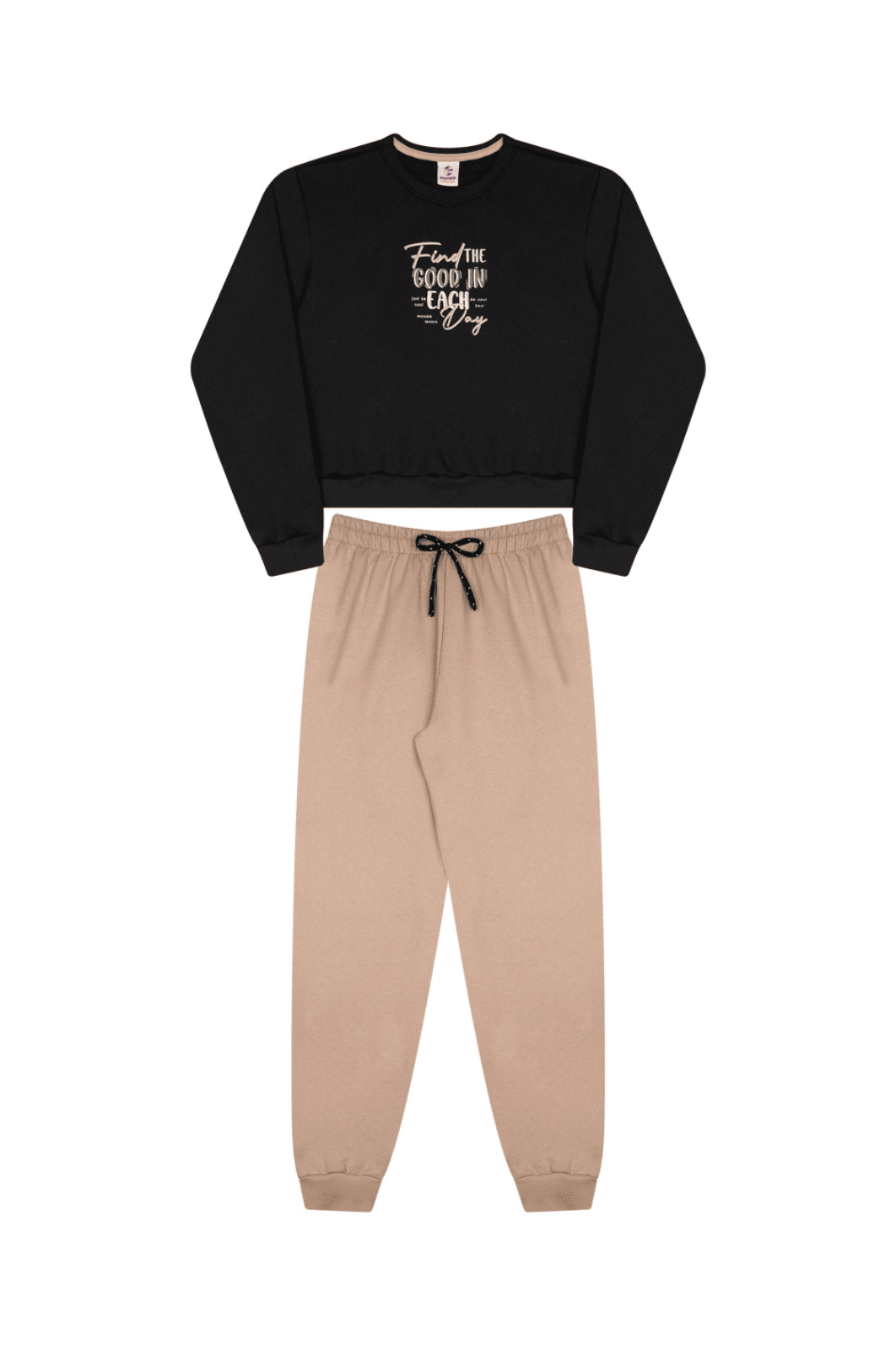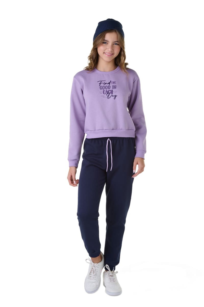 Este conjunto é perfeito para quem busca um visual atual e confortável. O blusão em moletom tem caimento leve, enquanto a calça com punho e cordão complementa com praticidade. As cores lilás candy e preto são modernas e fáceis de combinar.